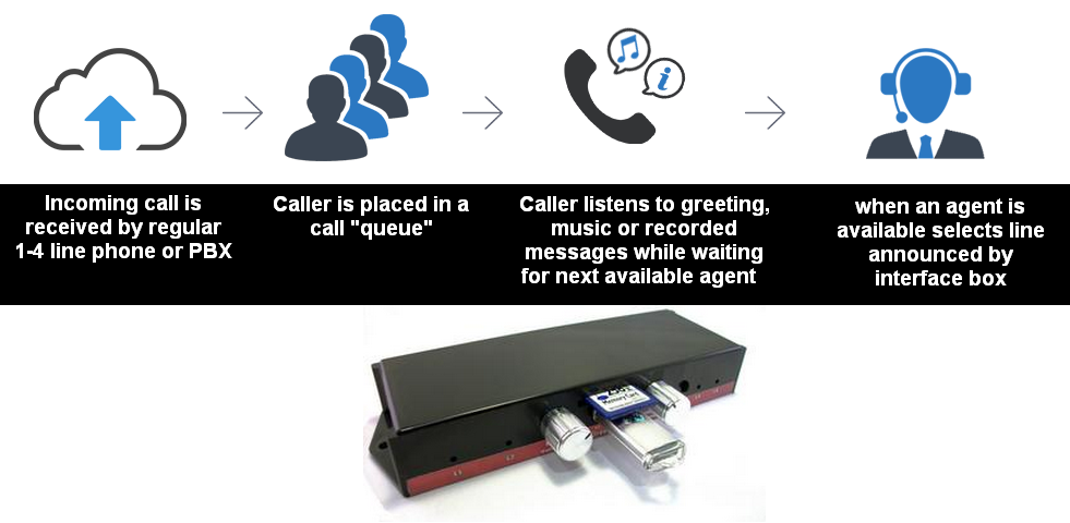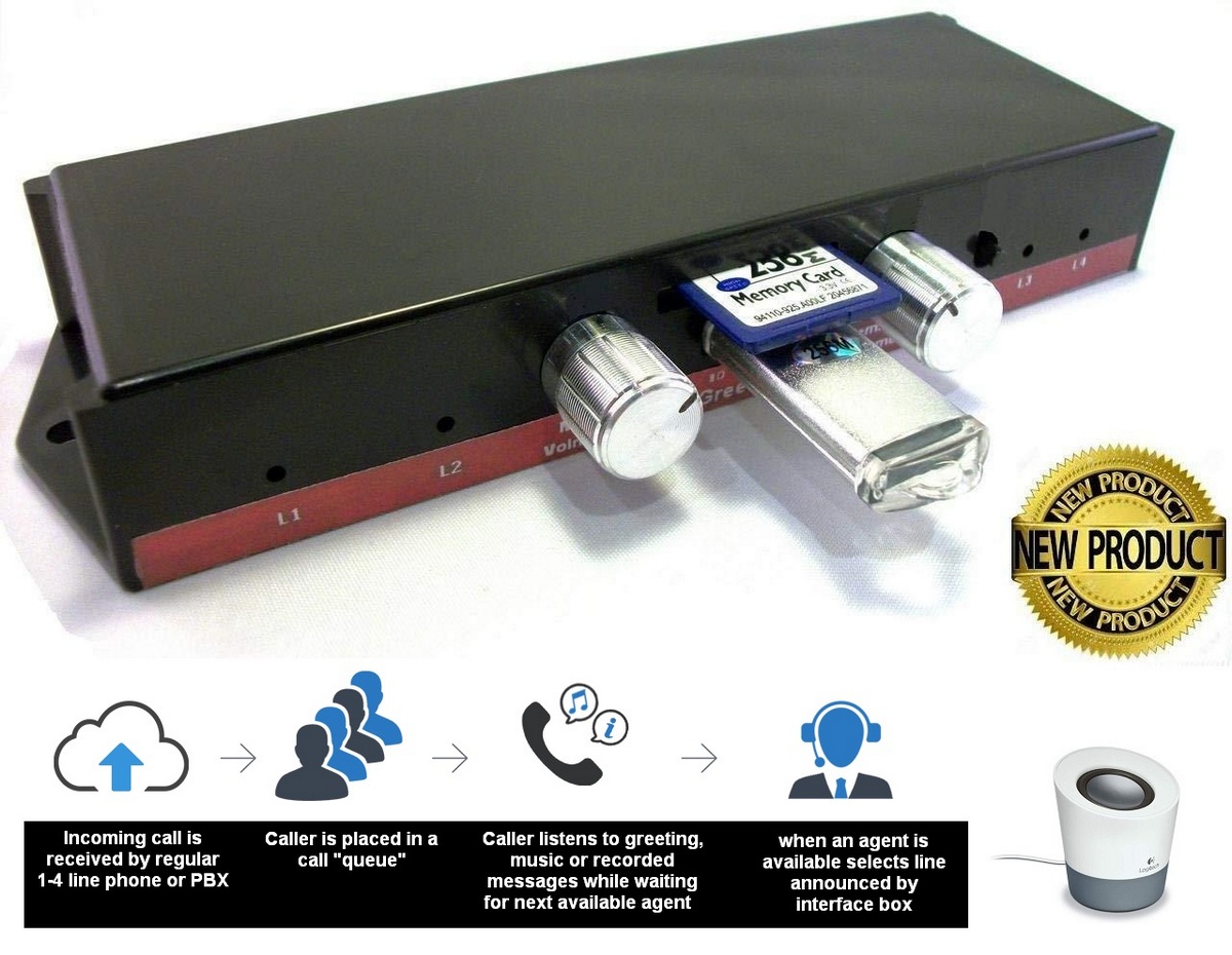 Call Handler Pro™ answers your incoming calls & keeps your callers on Hold until the next available employee can handle the calls (callers are 1st greeted then hear music and messages while on hold – device announces lines you need to take every 30 seconds)